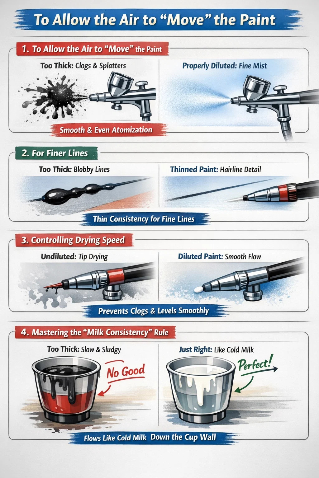 Selv maling merket "Airbrush Ready" krever ofte små justeringer basert på dagens temperatur, lufttrykk og ønsket effekt.